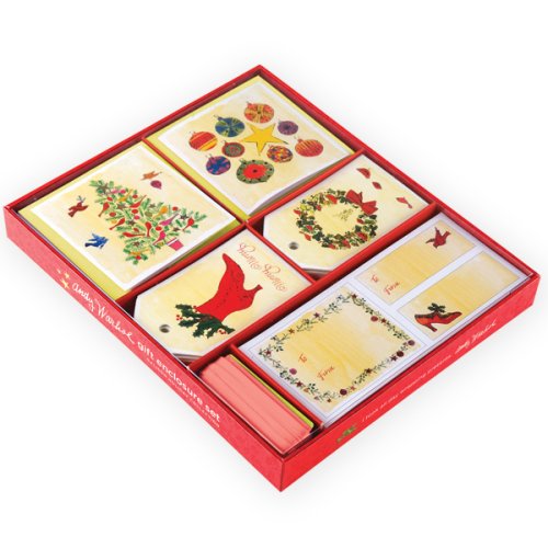 Decorate and tag your holiday gifts in style! With this gift enclosure set you will never mix up presents again, you can tag presents to be sent far away. Never use them for fruitcakes! (Just kidding.) This Christmas Potpourri gift enclosure set uses images by Andy Warhol in collaboration with the Andy Warhol Foundation for the Visual Arts, Inc. Images include a garland, a wreath, a holiday fashion boot, ornaments, and the birds deocrating a Christmas tree. Each gift package accessory set neatly holds 12 2-2/3 square tent gift cards (2 different images) 12 color-matched envelopes 24 2-3/4 x 1-2/3 gift tags with a punched hole (2 different images) 3 yards of ribbon for attaching the tags 20 sticker sheets each holding 3 designs for a total of 60 sticker to and from labels