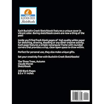 Each Buckskin Creek Sketchbook features a unique cover in vibrant color. Boring sketchbook covers are now a thing of the past!Inside you'll find fresh blank pages of high quality white paper for sketching, drawing, doodling or any other creative activity. Each page features a simple rectangular frame with rounded corners that provides a crisp, clean open space to draw within.Perfect for personal use, they also make unique gifts. Set your creativity free with Buckskin Creek Sketchbooks!The Three Trees, AutumnClaude MonetSketchbook200 Blank Pages8.5 x 11 Inches